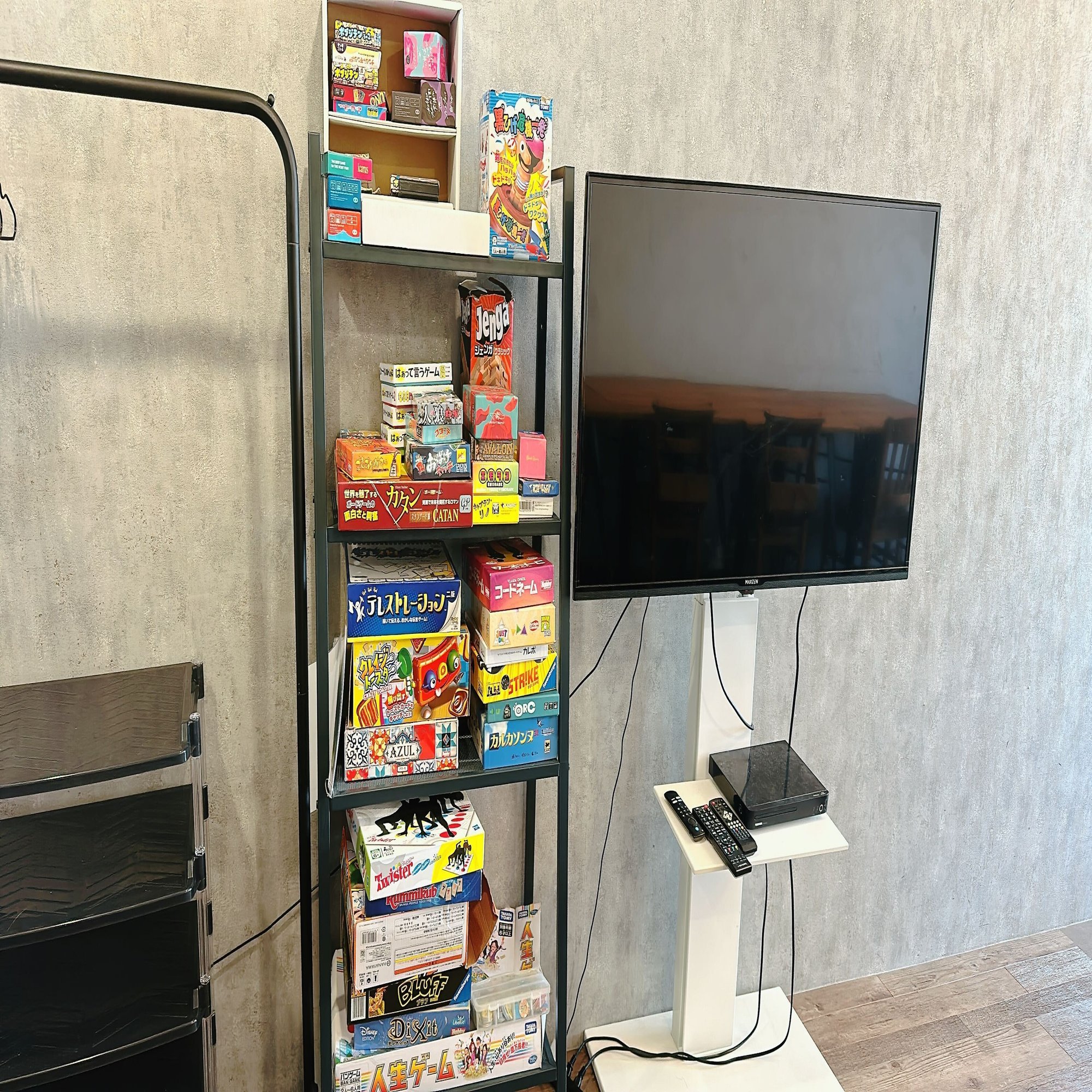 今回はボードゲームが沢山置いてあるパーティースペースを使用して世界のボードゲーム会を開催しました。部屋に入ると豊富に取り揃えられたボードゲームが棚に置いてあり、ボードゲーム好きにはたまらない空間が広がっていました。