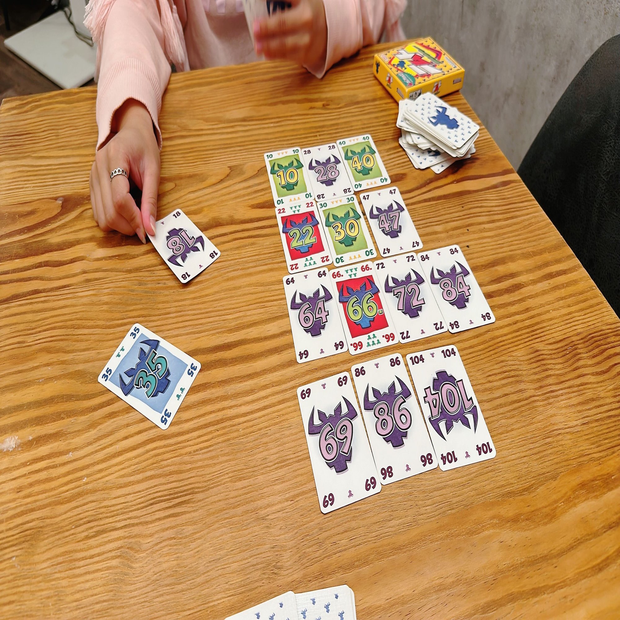 →ニムトは初めにカードを各プレーヤーに10枚ずつ配り、山札の中から4枚1列に揃えます。そして、各プレーヤーはカードを一枚ずつ選び裏向きにして中央に並べます。そして全員のカードが揃ったら表向きにして数字の少ないプレーヤーから列に並んでいる数字に一番近いところの隣におきます。そして、横並びに6枚置いてしまったらプレーヤーはその列のカードを引き取らなければなりません。それを繰り返し行ってカードに書いてある牛の数が多くない人が勝ちとなるゲームです。