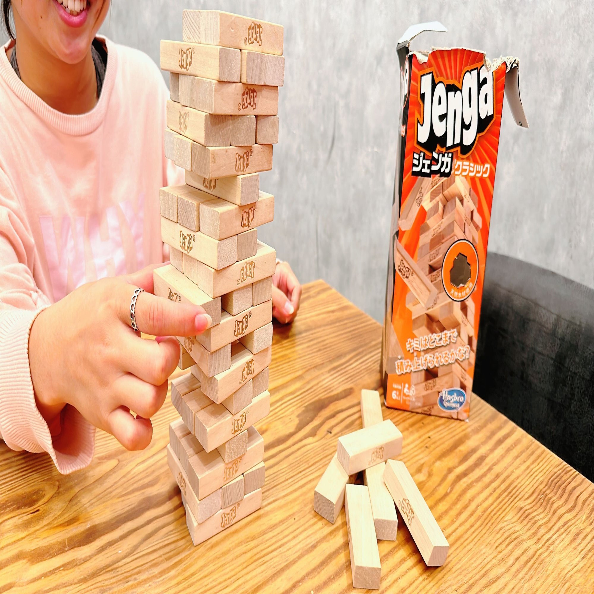 →ジェンガは誰もが一度はプレーしたことがあるのではないでしょうか。ピースが積み上げられたタワーの中から一つずつピースを引いていきタワーを崩した方が負けというゲームです。