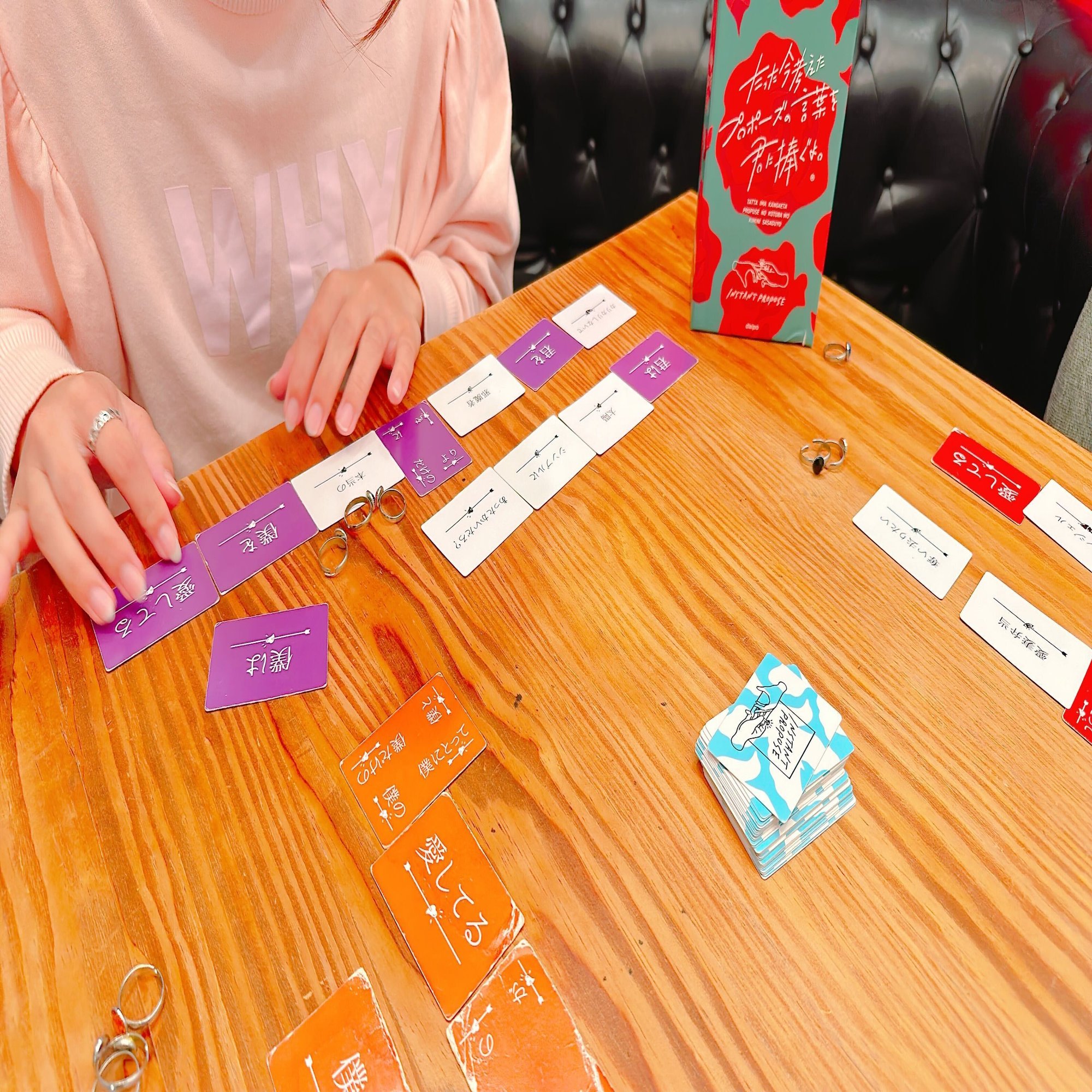 →ルールはとても簡単です。配られたカード6枚の中から「親」の人が顔を伏せて10秒数えるうちに自由に組み合わせて最高のプロポーズの言葉を考えて一番刺さるプロポーズができた人が勝ちになります。